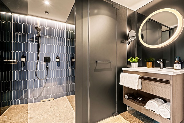 Für die Glasduschen in den 178 Hotelzimmern entschied sich TARDIS für maßgeschneiderte Lösungen, die perfekt auf den warmen, dunklen Interior-Stil des Hotels abgestimmt sind. Das 8 mm dicke, satinierte Dark-Grey-Glas (DecourFlou) sorgt für eine edle, zugleich zurückhaltende Optik. Die Sonderanfertigungen kombinieren moderne Beschlagtechnik der Serie SP in der Oberfläche CAVIAR (Aluminium, gebürstet und schwarz-matt eloxiert) mit dezenten schwarzen Dichtungen und integrierten Handtuchhaltern als Griff. Diese hochwertige Systemlösung vereint Ästhetik und Alltagstauglichkeit und setzt den Standard für moderne Glas im Bad.