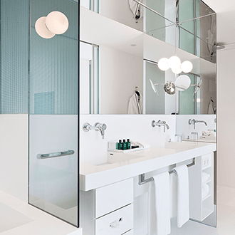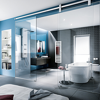 Lassen Sie sich inspirieren von den vielfältigen Einsatzbereichen von Glas im Bad, sei es als rahmenlose Dusche, Sauna bis hin zur stylischen Glastür und entdecken Sie unsere Auswahl an Designgläsern für stilvolle Badkonzepte – funktional, hochwertig und immer ein Blickfang.