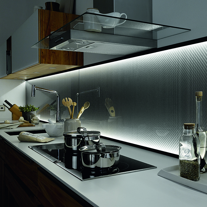In der Küche wird Glas nicht nur aus ästhetischen Gründen geschätzt, sondern auch für seine Funktionalität. Lacobel lackiertes Glas, als Küchenrückwand oder Arbeitsplatte, ist besonders beliebt, da es in zahlreichen Farben erhältlich ist und eine moderne, elegante Optik bietet. Es ist äußerst pflegeleicht und resistent gegen Feuchtigkeit und Flecken. Madras geätztes Glas wird häufig als Küchenfront verwendet, da es eine besondere Struktur hat und der Küche eine edle Optik verleiht. Für eine ganz besondere Atmosphäre sorgen LED-Flächenlichter hinter Glasflächen, die als beleuchteter Spritzschutz bzw. Küchenrückwand eingesetzt werden. Sie bieten nicht nur eine funktionale Beleuchtung, sondern schaffen auch ein stilvolles, modernes Ambiente und setzen besondere Designakzente.